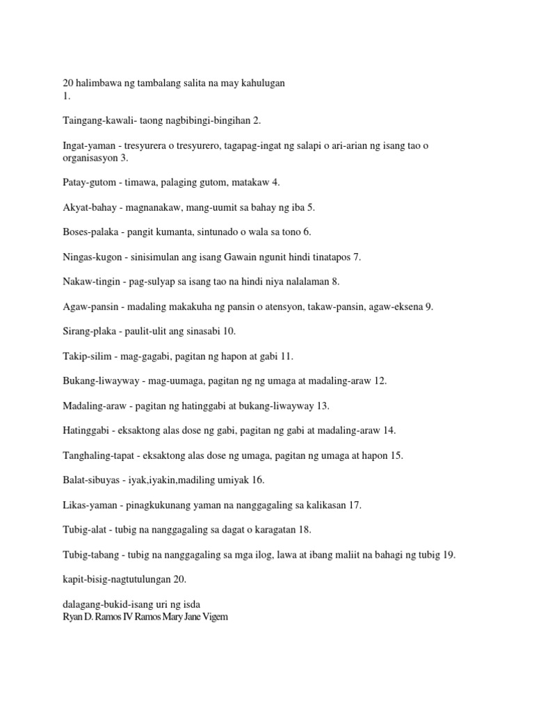 20 Halimbawa Ng Tambalang Salita Na May Kahulugan Docx