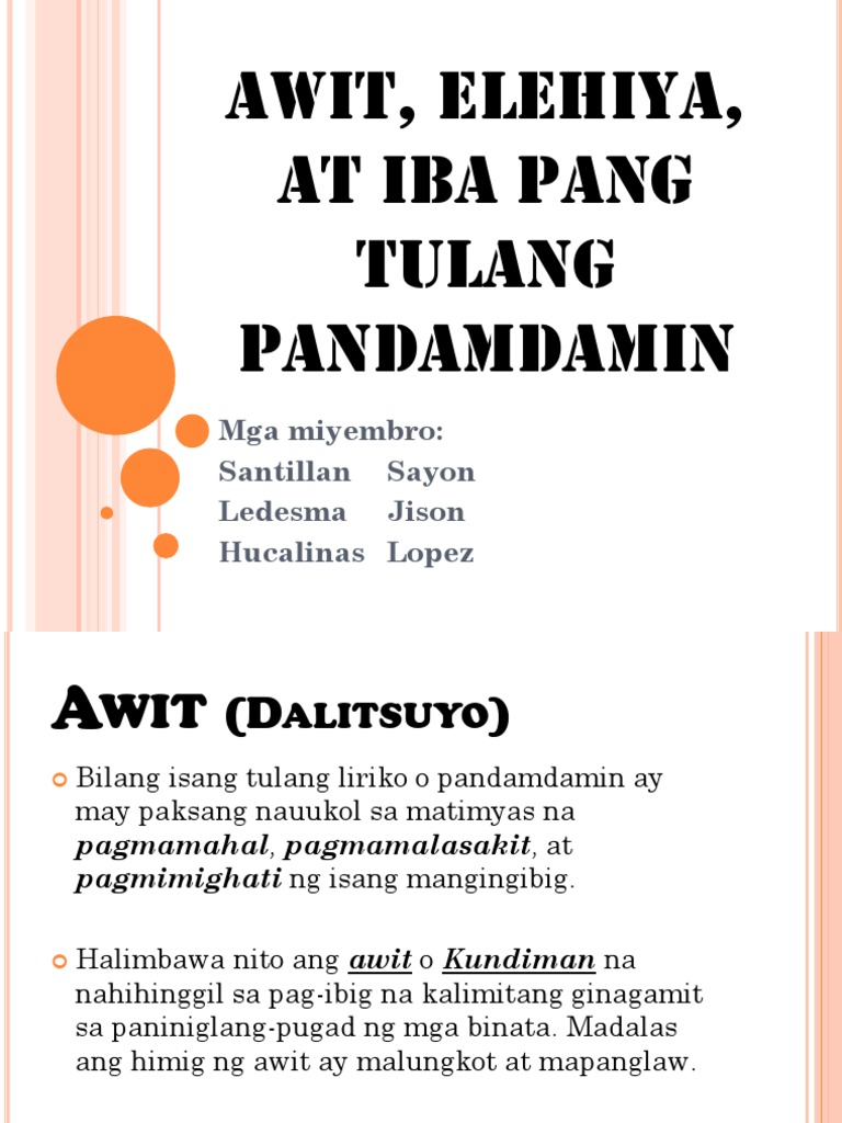 Mula sa naiisang tahanan Walang imahe walang anino at walang katawan Ang lahat ay nagluluksa ang burol ay bumabab ang bukid ay nadaanan ng unos Malungkot na lumisan ang tag-araw Kasama ang pagmamahal na inialay Ang isang anak ng aking ina ay hindi na makikita Ang masayang panahon ng pangarap. Awit soneto oda dalit elehiya. Filipino 9 Elemento ng Elehiya 1.