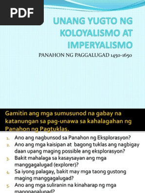 Sa Unang yugto ng imperyalismo at kolonyalismo umiral ang prinsipyong pang-ekonomiyang merkantilismo sa Europa. Ano Nga Ba Ang Imperyalismo. Ano ang kahulugan ng tinamo.