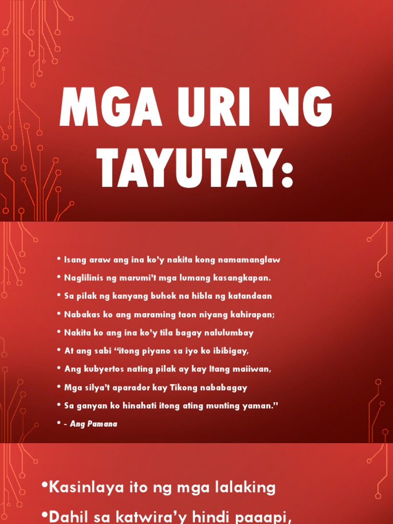 Sa guhit ng kanyang pisnging lumalalim araw-araw nakita kong ang ina koy tila mandin namamanglaw At ang sabi. Ngunit sa tula din ay mapapansin mo na hindi ito mahalaga sa anak kung anuman ang makuha niyang mana dahil mas importante para sa kanya ang pagmamahal na nakukuha sa ina. Literal na kahulugan ng salaping pilak.