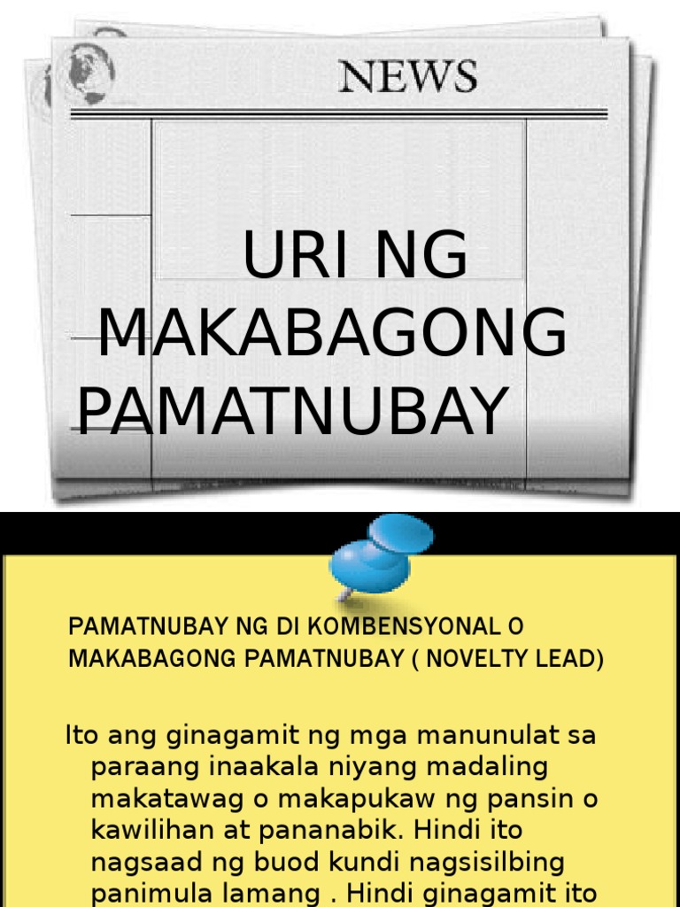 Jose Villa Panganiban ay pinipiga nito ang hahantungang kahulugan ng isang balita pangyayari o kalagayan. Makatawag pansin na pangungusap. Isang tanong isang salawikain pasalaysay na panimula tuwirang sabi.