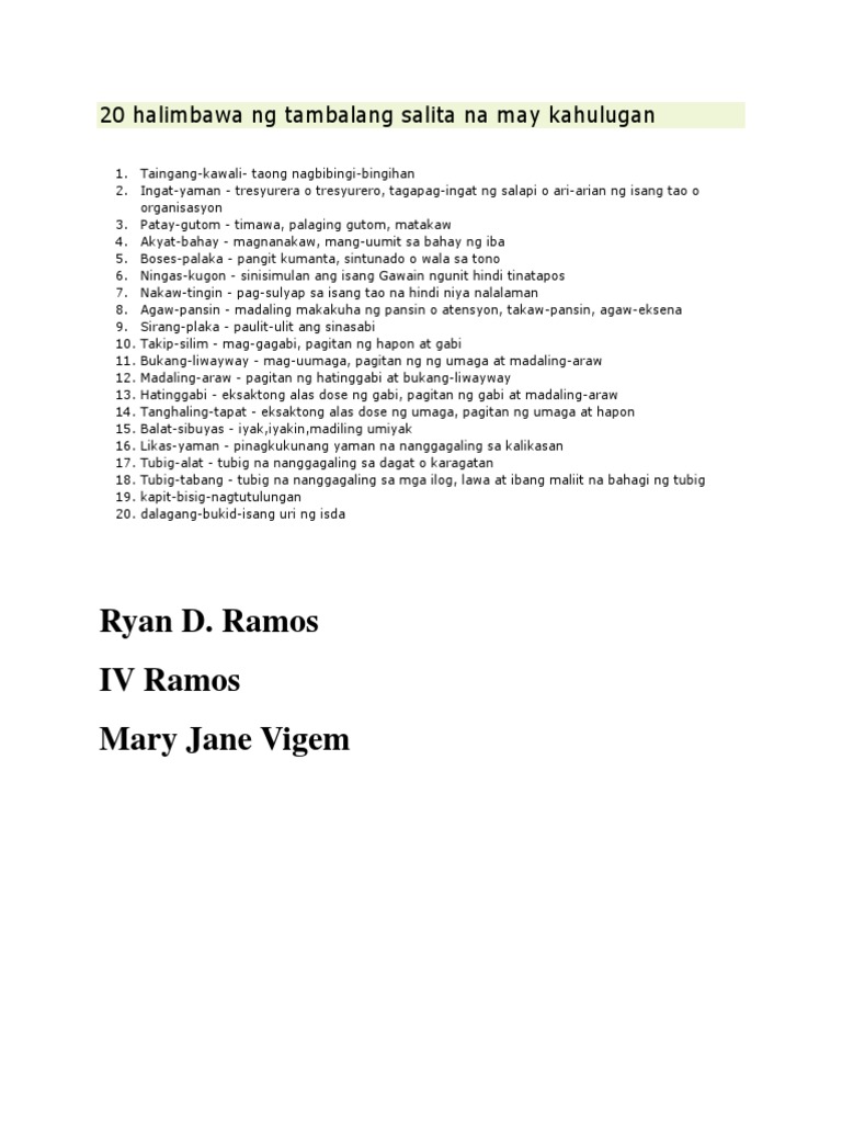 20 Halimbawa Ng Tambalang Salita Na May Kahulugan
