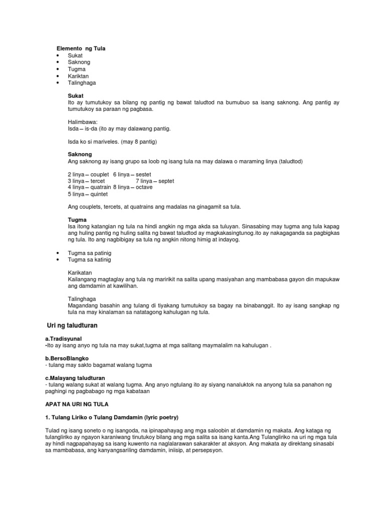 Mapalad ka lahat ng hinahanap mo nasa dokumentong ito. Ito ay isang uri din ng sining na may kanya kanyang anyo. Tula elemento at uri nito 1.